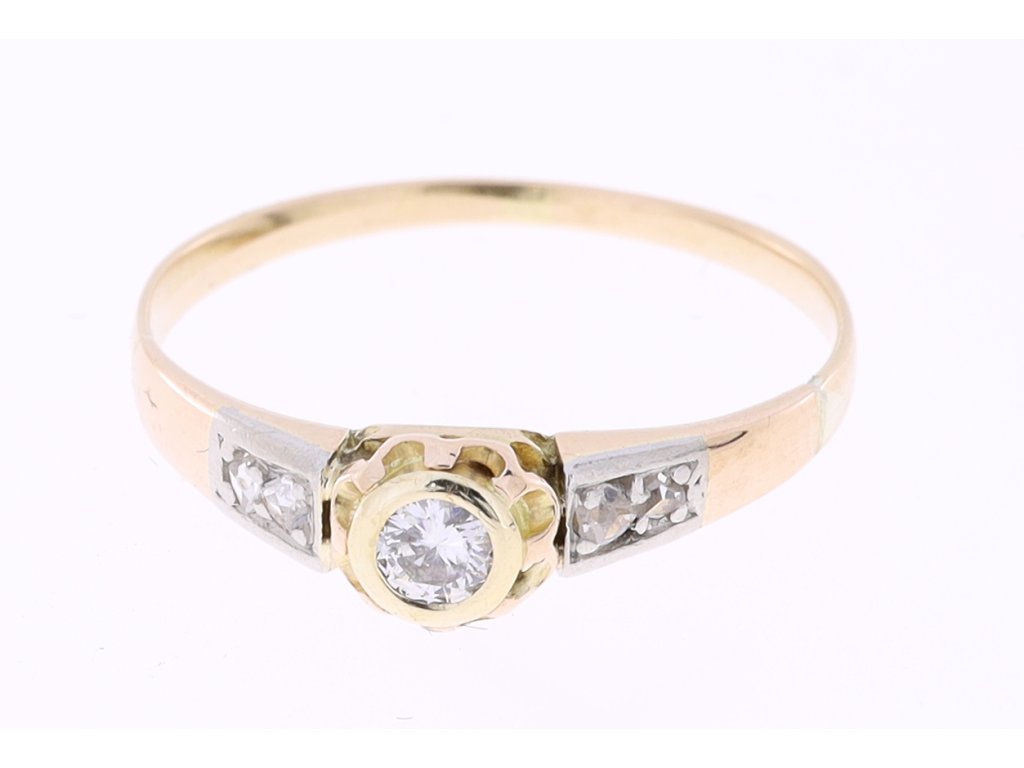 Jemný a velmi noblesní prsten z počátku 20. století, vytvořený tradiční kombinací žlutého zlata a platiny. Šína prstenu je ze zlata Au 585, zatímco hlava nese vyšší ryzost Au 750. Diamanty jsou zasazeny do platinové slitiny, jak bylo pro tuto éru typické. Centrální diamant společně se čtyřmi bočními má celkovou váhu 0,13 ct, což dodává prstenu decentní, starosvětský třpyt. Lehké a elegantní provedení krásně odráží šperkařskou estetiku počátku 20. století.