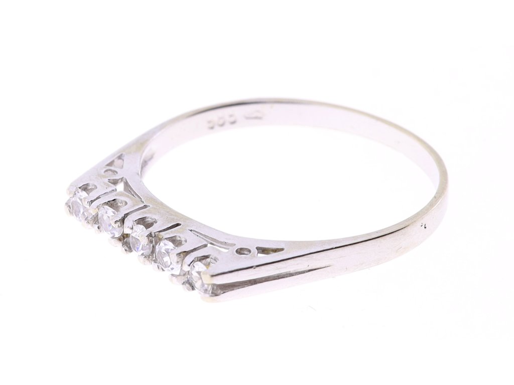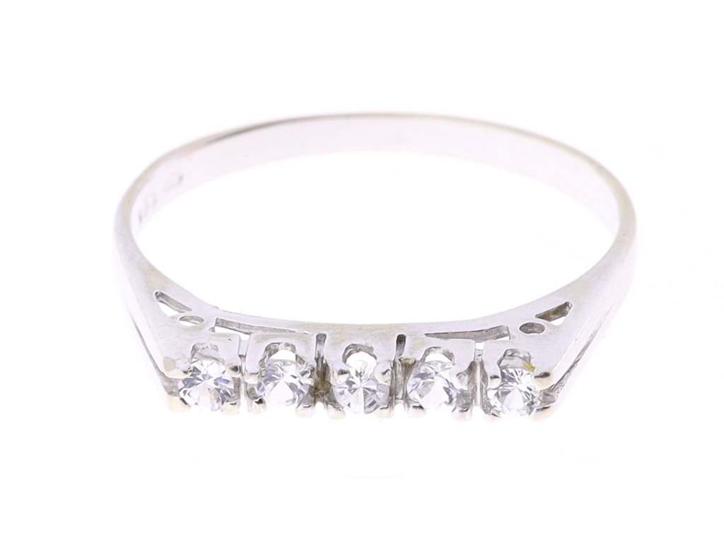Elegantní dámský prsten z bílého zlata o ryzosti 585/1000 (14 kt), osazený pěti drobnými diamanty o celkové hmotnosti cca 0,15 ct. Prsten je lehký, vkusný a ve velmi dobrém stavu – ideální jako decentní šperk pro každodenní nošení i slavnostní příležitosti.