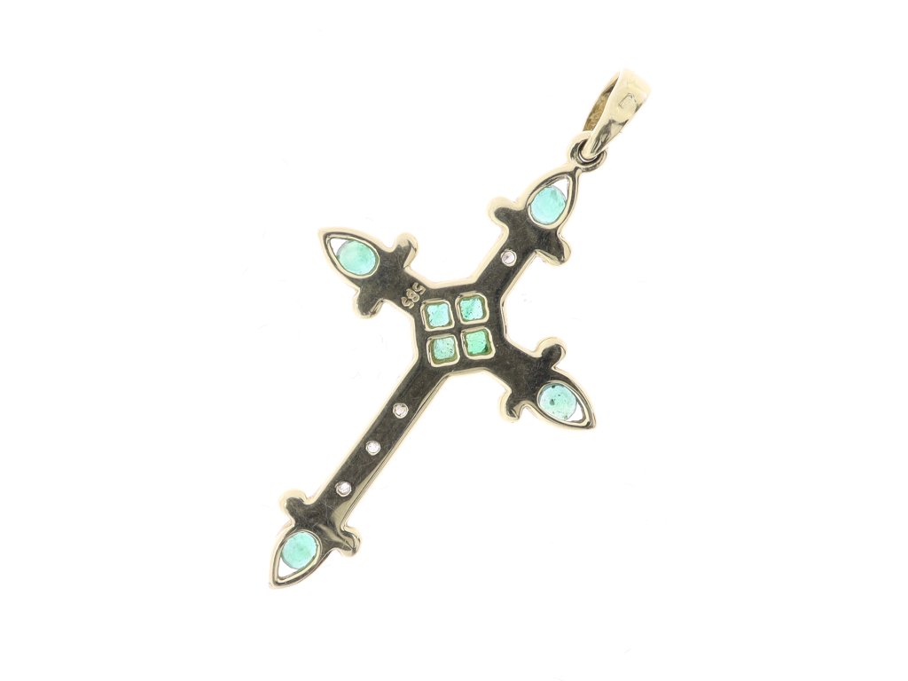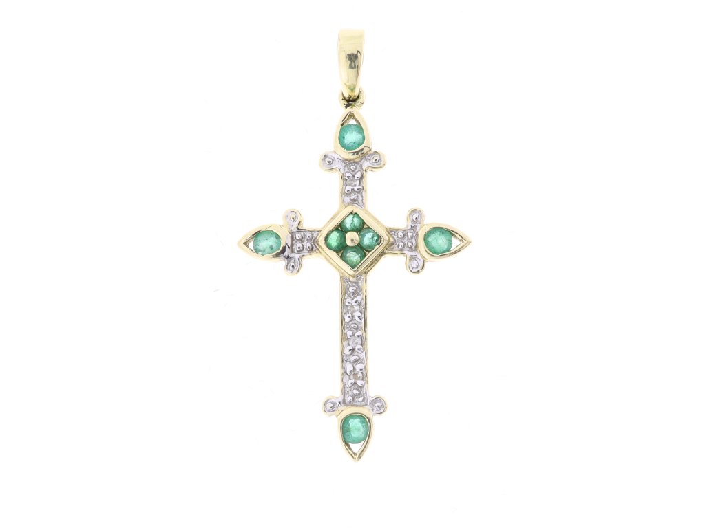 Elegantní přívěsek ve tvaru kříže, osazený smaragdy a drobnými diamanty. Nadčasové zpracování ve žlutém zlatě podtrhuje jemnou barvu kamenů a dodává šperku výjimečný charakter.