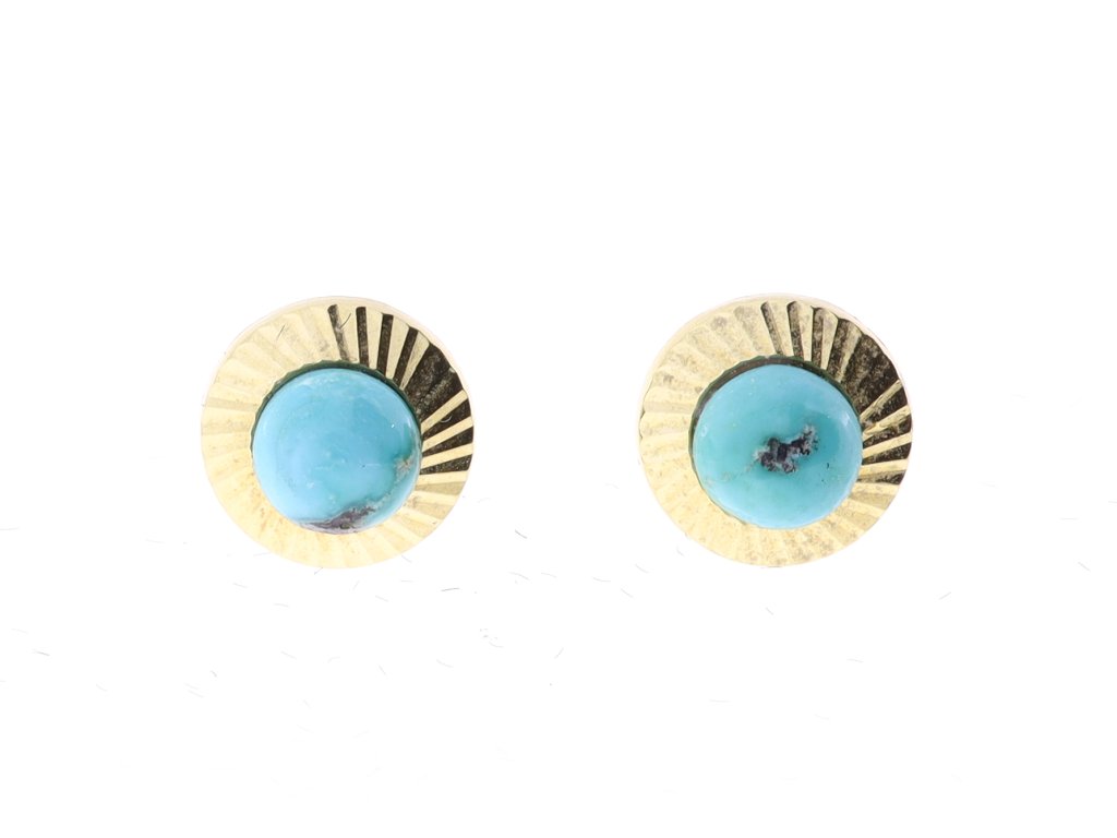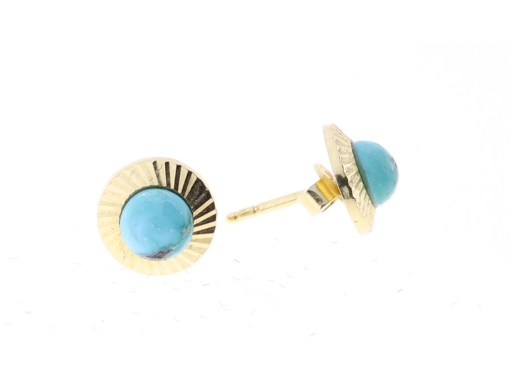 Jemné dámské náušnice ze žlutého zlata o ryzosti 14k, osazené přírodními tyrkisy. Elegantní klasika 60. let, uzavíraná na pohodlnou puzetu. Lehký, decentní šperk vhodný pro každodenní nošení i sběratelské účely.